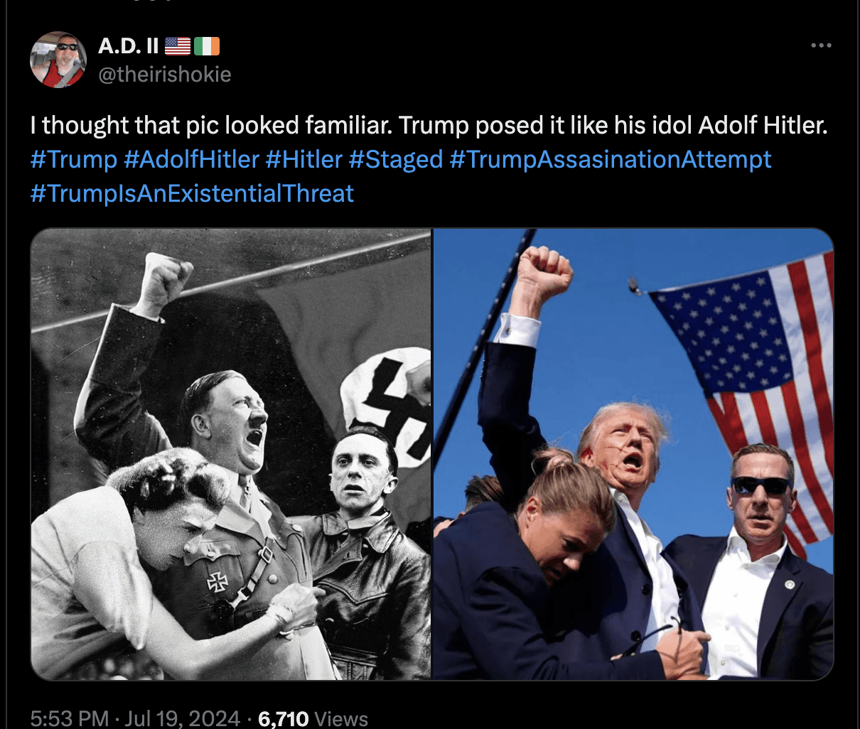 Besides these simple uses, cheapfakes are also often used to create content that causes at least mild discomfort within society. For example, in this image, former U.S. President Donald Trump is said to be striking a victory pose after a shooting, inspired by Adolf Hitler.